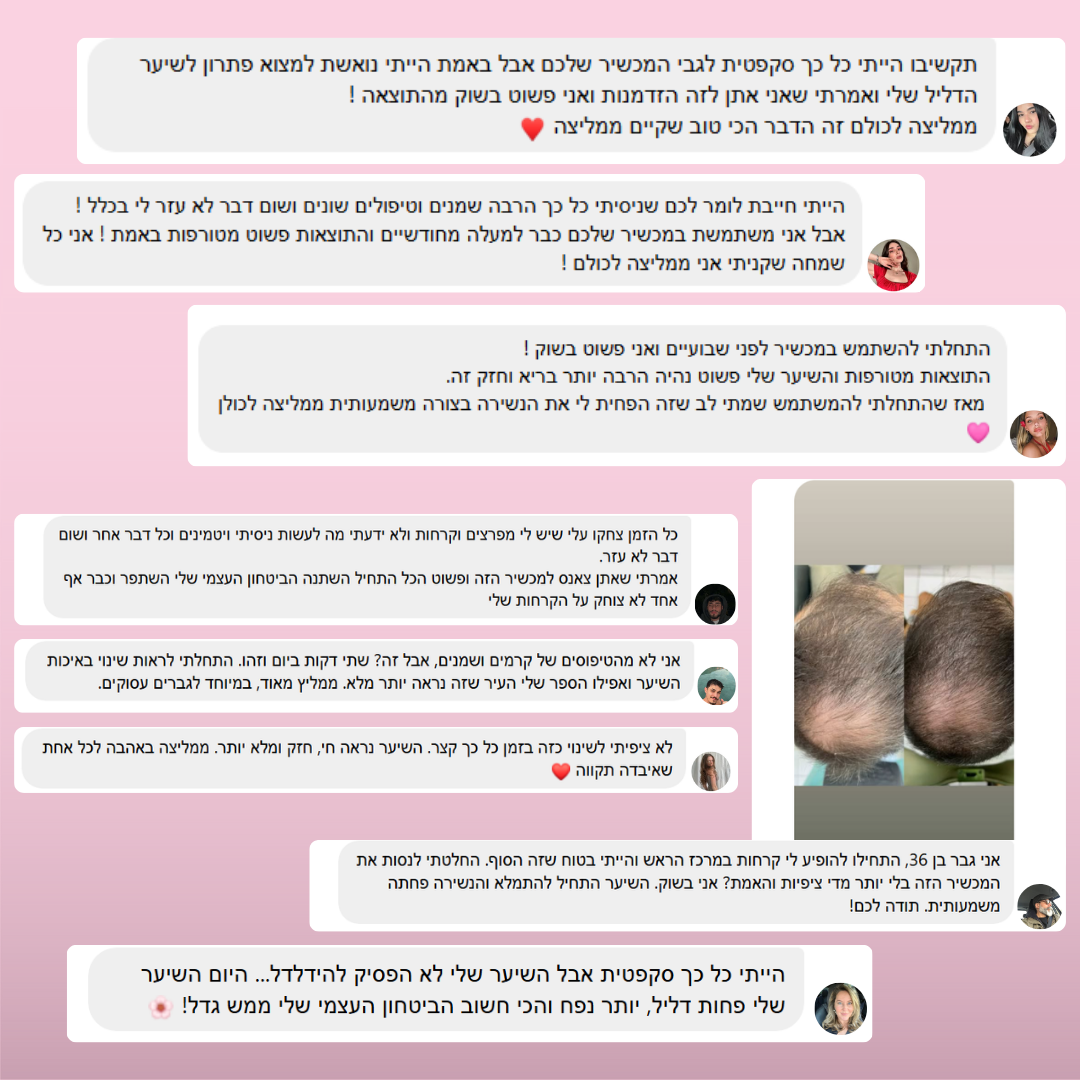 מעל 15,000 נשים וגברים כבר רואים את ההבדל. שיער חזק, מלא, ובריא יותר. זה לא רק נראה טוב זה נותן תחושת ביטחון שתעיף אתכם לשמיים. עכשיו תורכם לטפל בשיער שלכם בצורה טבעית, נעימה וללא טיפולים כואבים או יקרים.