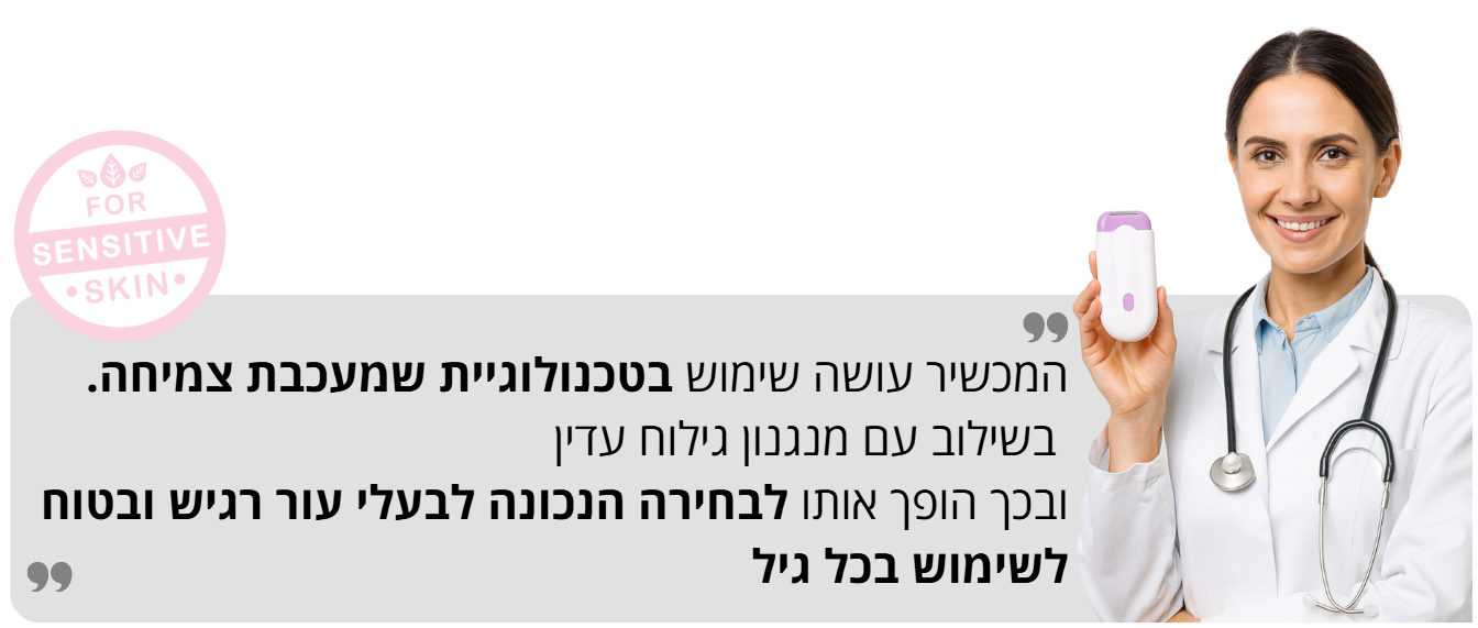 המכשיר פותח במיוחד עבור בעלי עור רגיש, בזכות הגילוח העדין והרח שבטוח לשימוש , בניגוד לטיפולי לייזר מקצועיים שיכולים לגרום לאדמומיות, גירויים או תחושת צריבה.